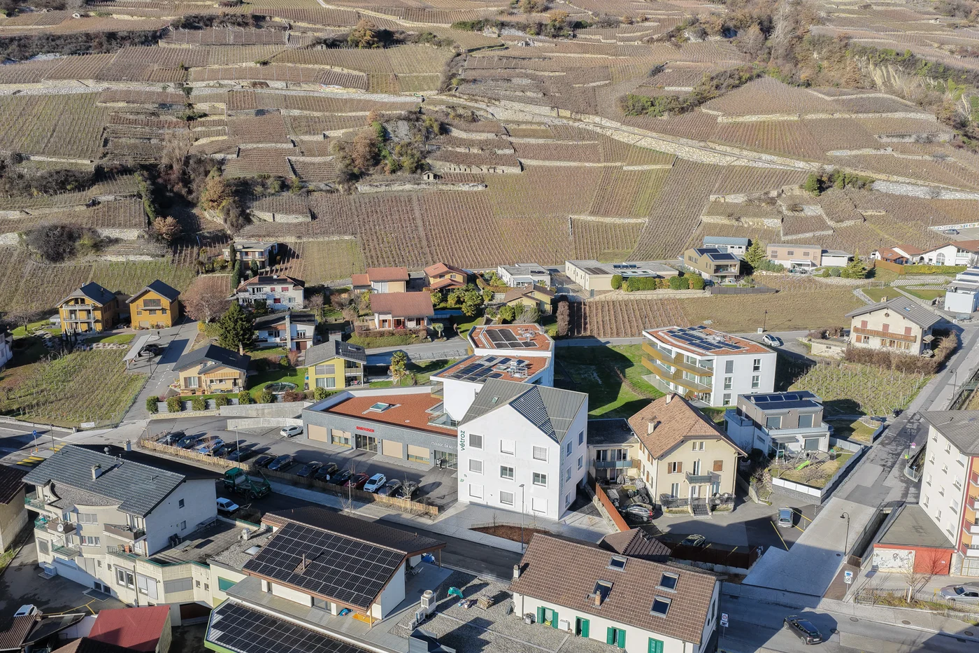 Idéalement située entre la route cantonale et la rue des Vignerons, la résidence est à proximité des petits commerces du centre et de toutes les commodités : écoles, cabinets médicaux et filiale de la Poste.